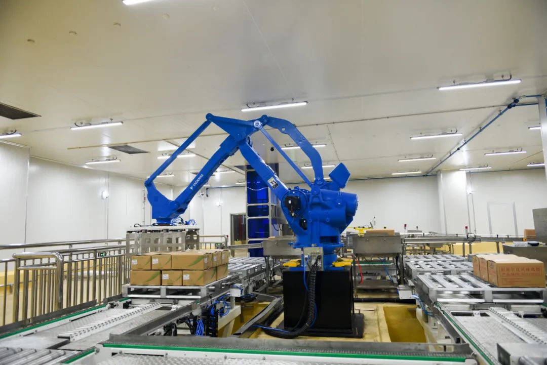 在圣农集团食品六厂车间,机械臂在进行自动化堆垛、装箱(资料照片)。